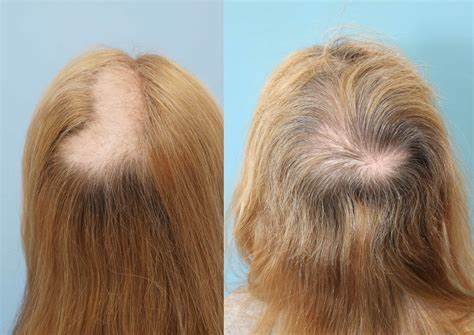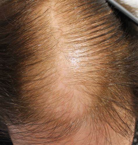 Nella donna la calvizie ha un inizio più tardivo, tra i 30 e i 40 anni, ed una progressione molto più lenta dell’analoga alopecia del maschio con un diradamento meno evidente ed una diffusione più ampia.