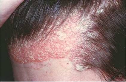 Nelle forme più gravi può essere interessato tutto il cuoio capelluto (psoriasi “a calotta” o “a caschetto”) ma l’estensione oltre il margine d’inserzione dei capelli è inferiore rispetto alla dermatite seborroica.